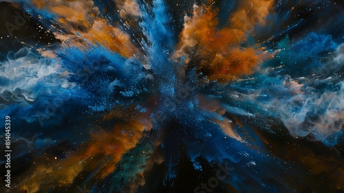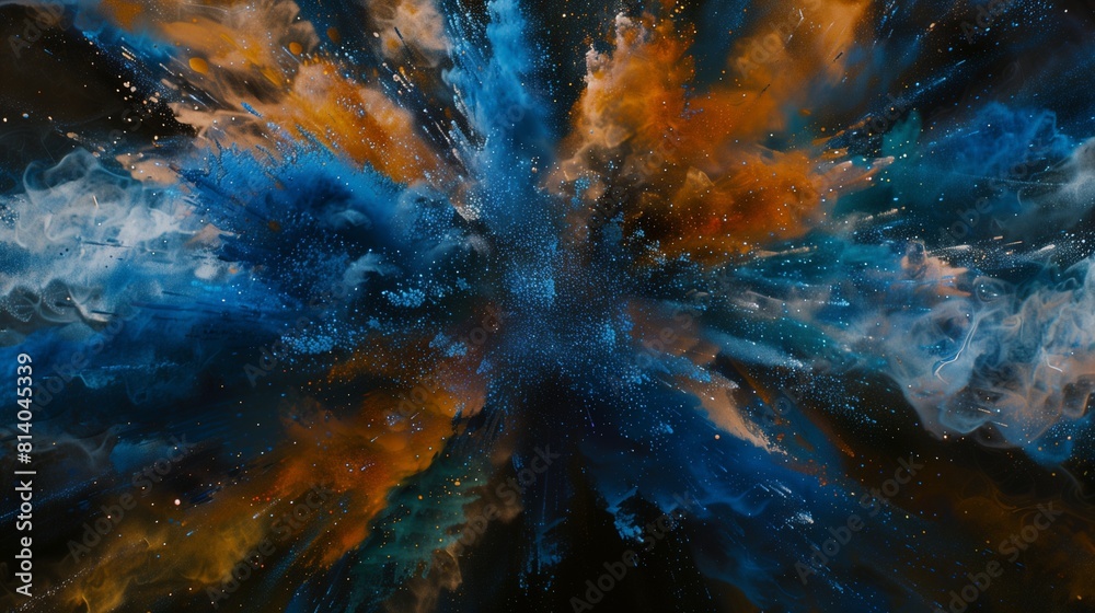 Wall mural an immersive and captivating illustration of abstract blue and orange color powder exploding in a bu - Wall murals Wall mural an immersive and captivating illustration of abstract blue and orange color powder exploding in a bu - Wall murals