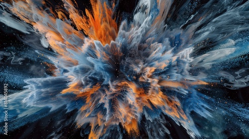 Wall mural an immersive and captivating illustration of abstract blue and orange color powder exploding in a bu - Wall murals Wall mural an immersive and captivating illustration of abstract blue and orange color powder exploding in a bu - Wall murals