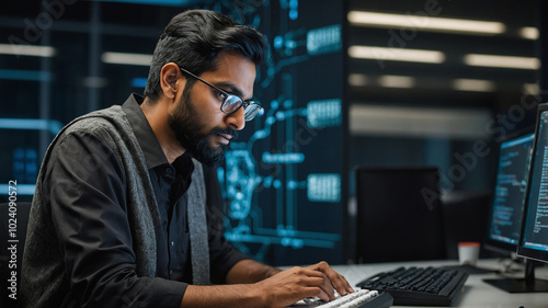 Wall mural an indian software engineer working on a futuristic computer writing a code in modern office environ - Wall murals Wall mural an indian software engineer working on a futuristic computer writing a code in modern office environ - Wall murals
