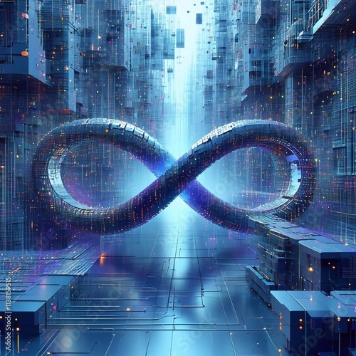 Wall mural : An infinity symbol made from glowing binary code particles sits on a futuristic background, symboliz