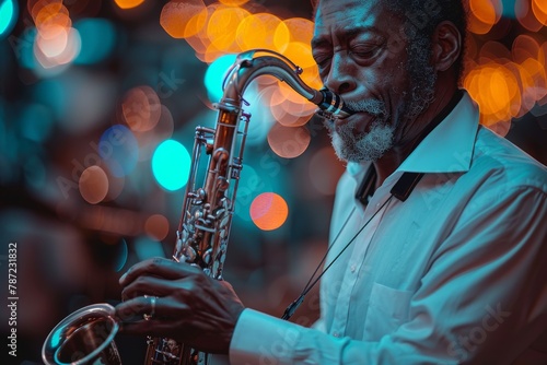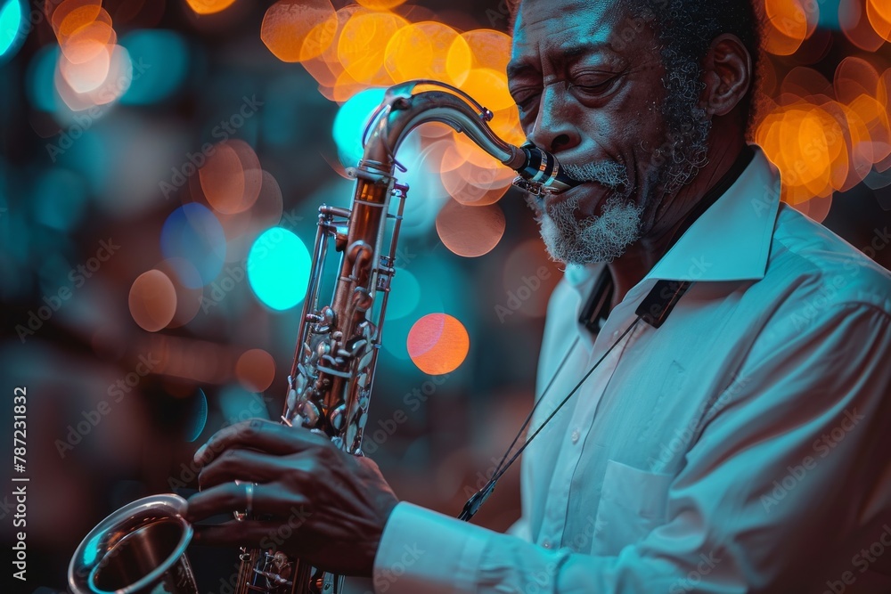 The watermark will not be included on Wall mural.: An intimate close-up capturing the hands of a saxophone player and the instrument's details with a b
