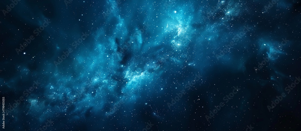 The watermark will not be included on Wall mural.: An intricate blue galaxy filled with numerous stars set against a stark black background, creating a
