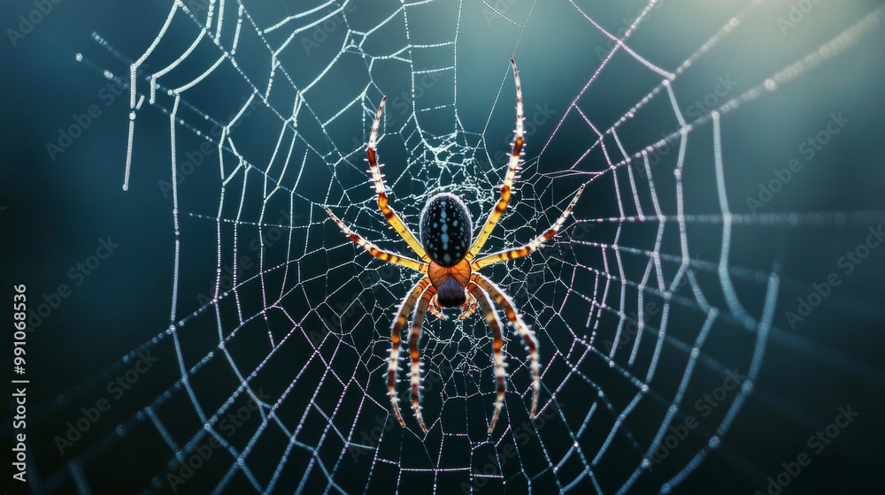 Wall mural : An intricate macro image of a spider weaving its web, showcasing the delicate threads and the skill
