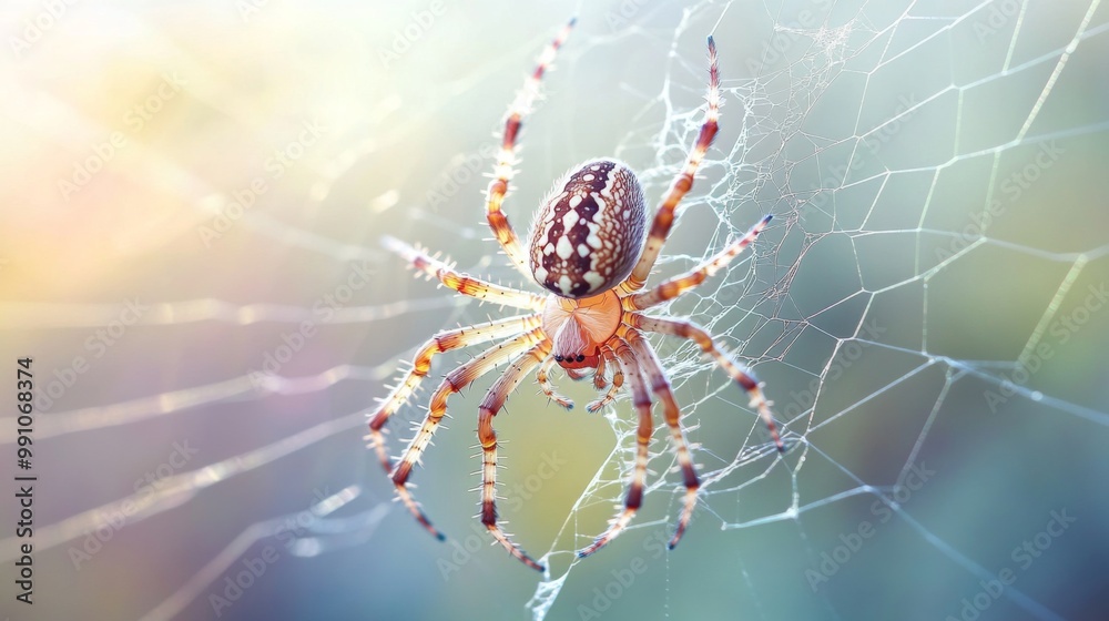 The watermark will not be included on Wall mural.: An intricate macro image of a spider weaving its web, showcasing the delicate threads and the skill