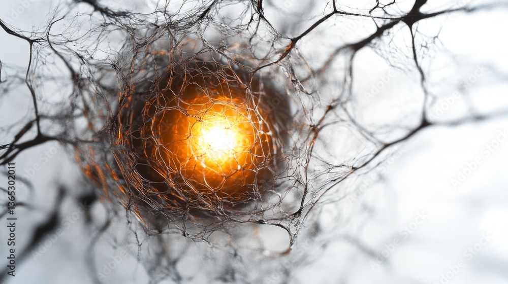 An intriguing close-up of a glowing nucleus surrounded by neural networks - the interplay of light anWall mural