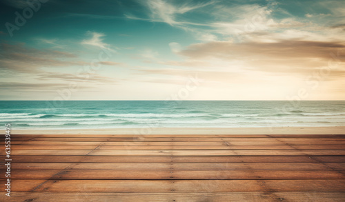 Wall mural an old wooden deck on the beach with the ocean looking out - Wall murals Wall mural an old wooden deck on the beach with the ocean looking out - Wall murals