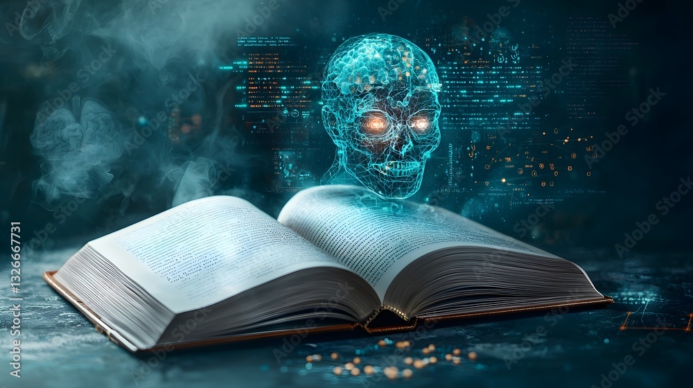 Wall mural an open book projecting a futuristic medical diagnostic interface displaying ai powered health analy - Wall murals Wall mural an open book projecting a futuristic medical diagnostic interface displaying ai powered health analy - Wall murals