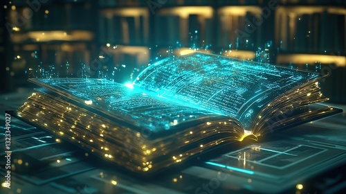 The watermark will not be included on Wall mural.: An open book with holographic digital code floating above it