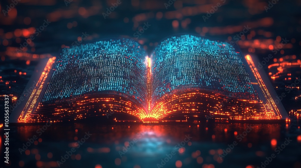 The watermark will not be included on Wall mural.: An open book with pages made of glowing digital data streams