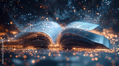 Wall mural an open book with pages morphing into digital data streams, illustrating the blend of education and