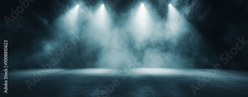 Wall mural : An open stage with smoke and fog in the background getting highlighted by spotlights, professional p