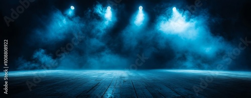 Wall mural : An open stage with smoke and fog in the background getting highlighted by spotlights, professional p