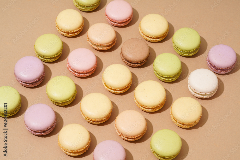 Wall mural : An overhead shot of a beige table surface featuring an array of colorful macarons in neat rows