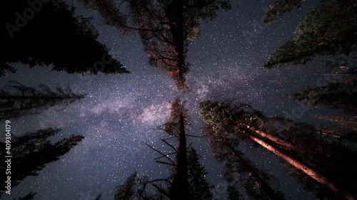 Wall mural an overnight time lapse of a hammock view looking up as the milky way and stars pass across the tree