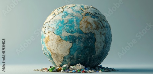 Wall mural : An stock image of a polluted planet earth surrounded by garbage on a grey background with copy space