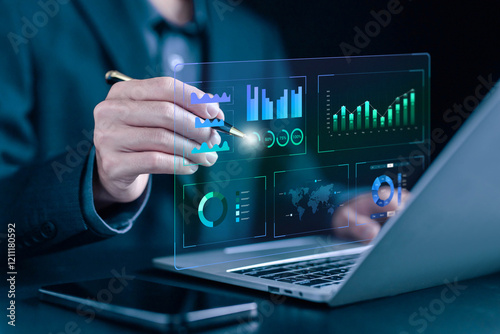 The watermark will not be included on Wall mural.: Analyst manages the system database reports, analytics business - analyzes data plans and shows a das