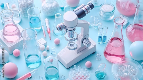 The watermark will not be included on Wall mural.: And minimalist flat lay composition of a science lab featuring a microscope flasks and test tubes in