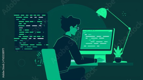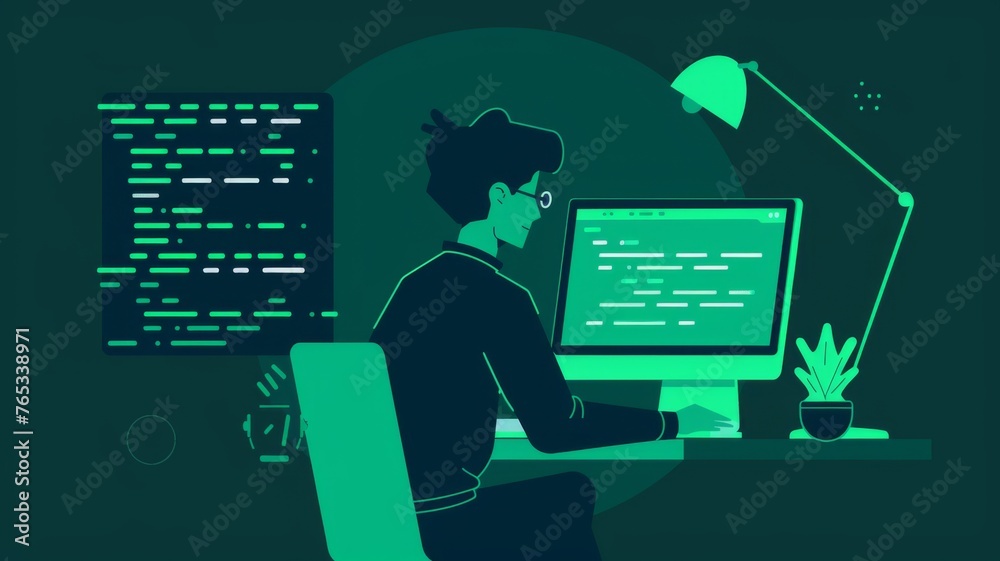 Wall mural animated developer working late at night - illustrated coder diligently working late at night on com - Wall murals Wall mural animated developer working late at night - illustrated coder diligently working late at night on com - Wall murals