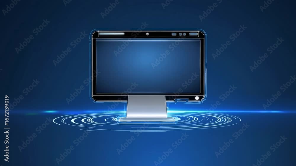 Wall mural : Animated sequence of digital computer icons and symbols floating on solid blue background representi
