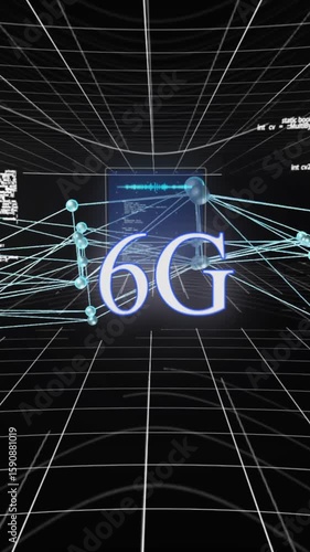 Wall mural animation of 6g text, digital data processing over connections on black background