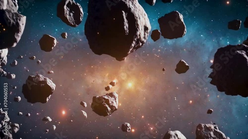 Wall mural : Animation of an asteroids field in deep blue space, floating stone, outer space, close-up view -