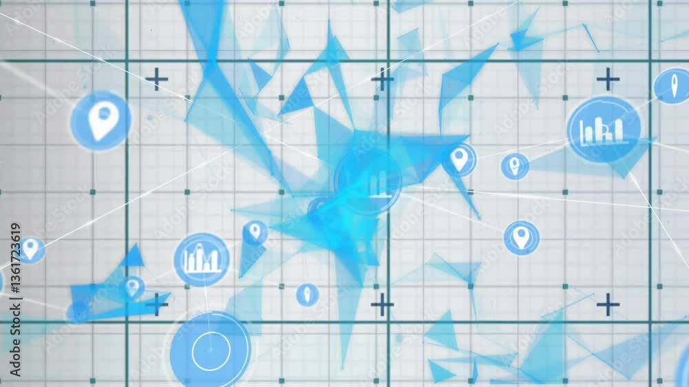 Wall mural animation of blue geometric shapes with data icons on grid background