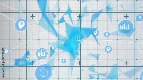 Wall mural : Animation of blue geometric shapes with data icons on grid background