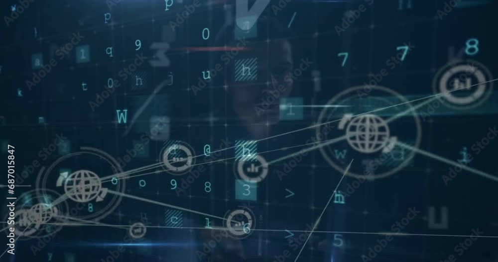The watermark will not be included on Wall mural.: Animation of connected globe and graph icons over multiple words, letters, numbers