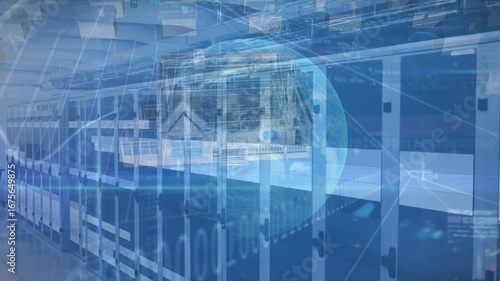 Wall mural animation of data processing with globe over digital houses and server room - Wall murals Wall mural animation of data processing with globe over digital houses and server room - Wall murals