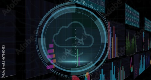 The watermark will not be included on Wall mural.: Animation of digital interface with data processing over black background