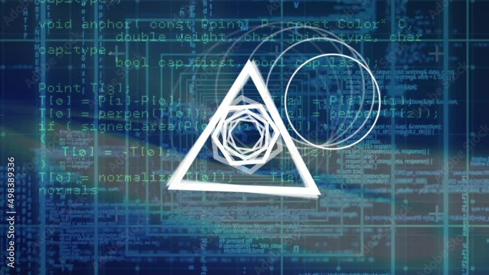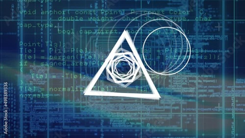 Wall mural animation of geometric shapes rotating over data processing in blue space