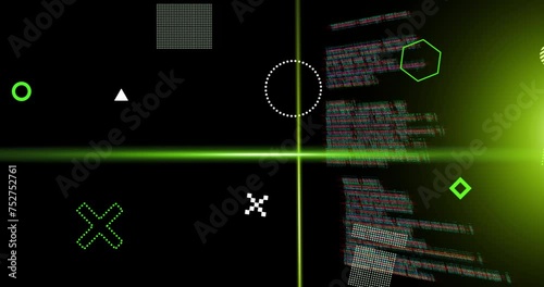 Wall mural animation of green scanner beams and rotating shapes over data processing on dark background - Wall murals Wall mural animation of green scanner beams and rotating shapes over data processing on dark background - Wall murals