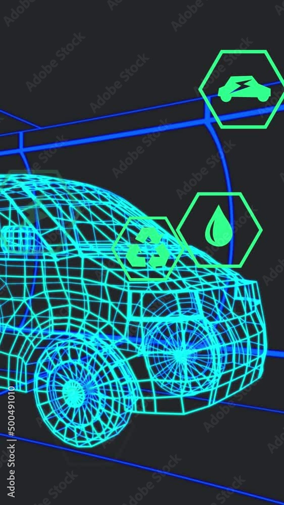 Wall mural : Animation of icons processing status data over 3d van model moving on black background