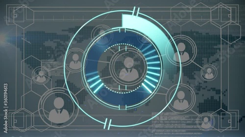 Wall mural : Animation of network of connections of people icons and scope scanning over world map