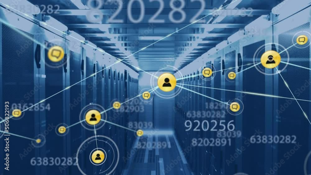 Wall mural animation of network of connections with digital icons and numbers over computer servers