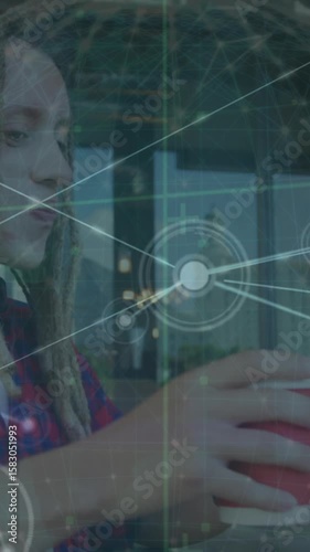 Wall mural animation of network of connections with globe and data over caucasian man using smartphone - Wall murals Wall mural animation of network of connections with globe and data over caucasian man using smartphone - Wall murals