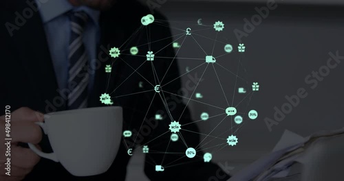 Wall mural : Animation of network of connections with icons over men using smartphone