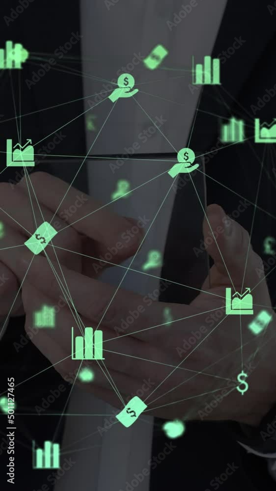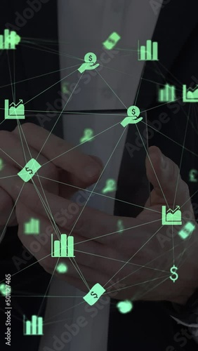 Wall mural : Animation of network of connections with icons over men using smartphone