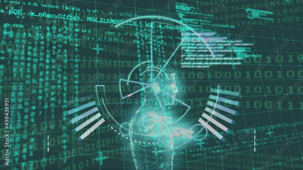 Wall mural animation of red shapes over scope scanning, human model and data processing on black background