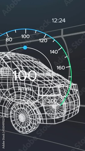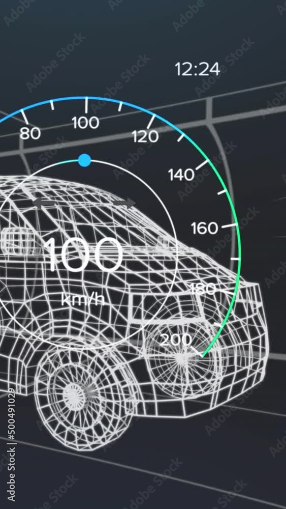 Wall mural animation of speedometer, gps and charge status data on vehicle interface, over 3d van model