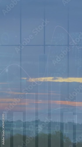 The watermark will not be included on Wall mural.: Animation of statistical data processing over aerial view of sunset sky and forest