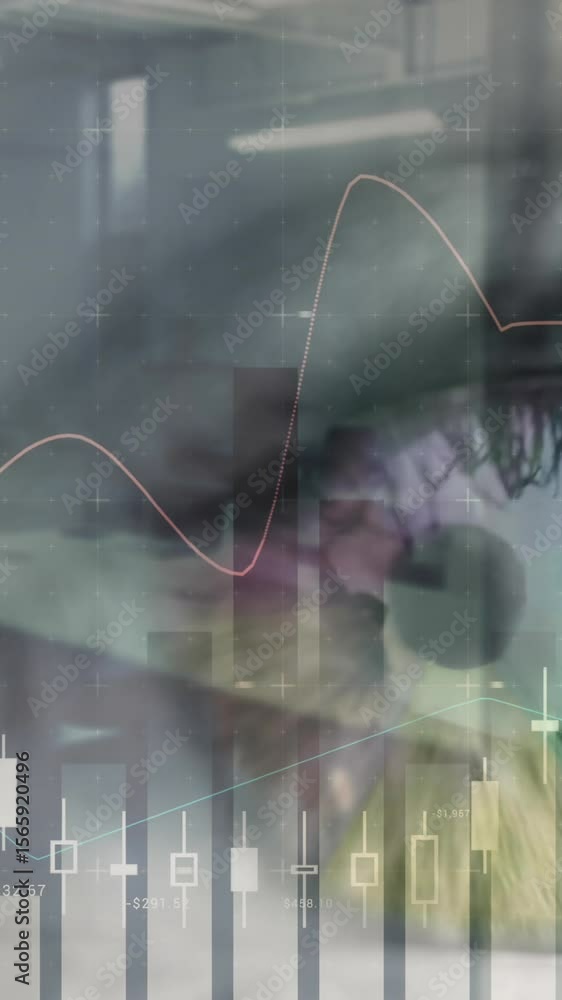 Wall mural : Animation of statistics and data processing over woman's eye in background