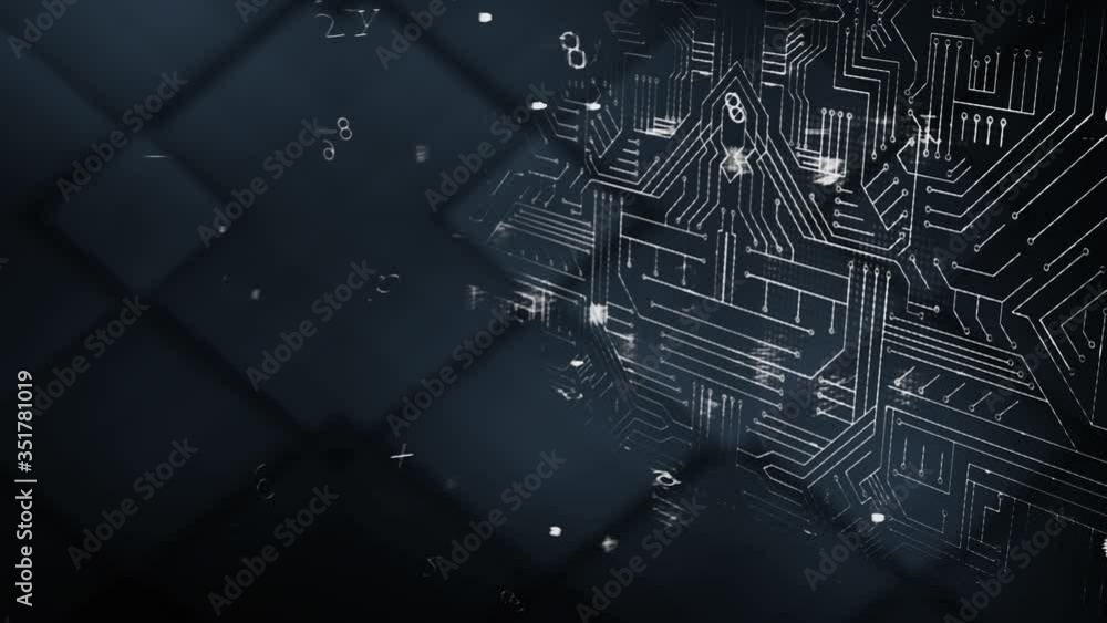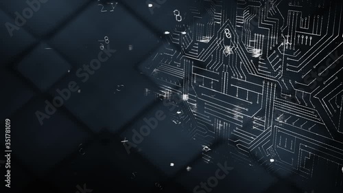 Wall mural animation of white padlock symbol with moving numbers and letters and a circuit board in the backgro