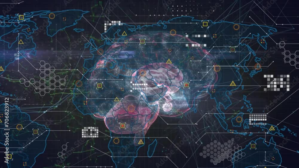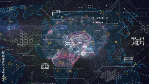 Wall mural : Animation of world map with data processing and digital brain and connections on black background