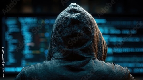 Wall mural : Anonymous hacker in hoodie analyzing data on computer screen, cybersecurity threat and digital crime