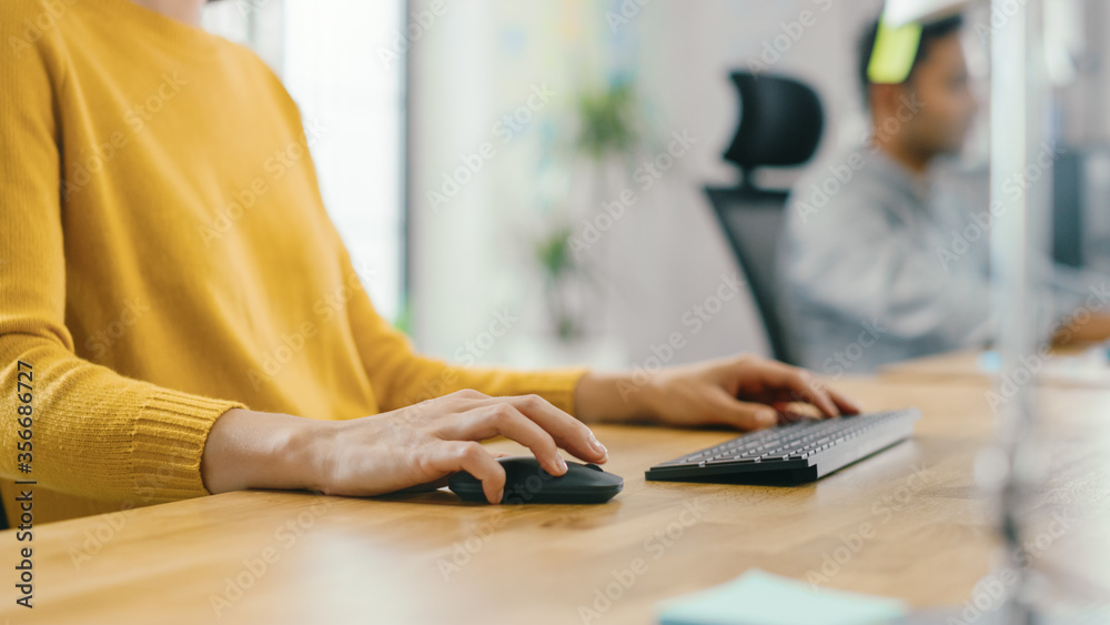 The watermark will not be included on Wall mural.: Anonymous young woman sitting at her desk using laptop computer - focus on hands using mouse and keyb