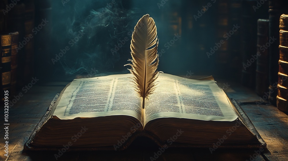 The watermark will not be included on Wall mural.: Antique book with a delicate feather standing in its pages set against a shadowy background creating