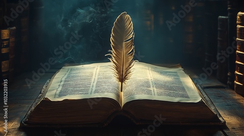 Antique book with a delicate feather standing in its pages set against a shadowy background creatingWall mural