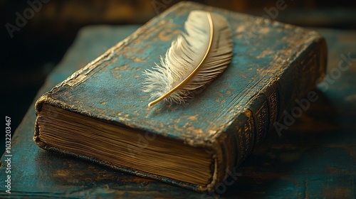 Wall mural : Antique book with a delicate feather standing in its pages set against a shadowy background creating