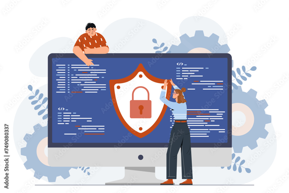 Antivirus software concept - man and woman near computer screen with code - programmers and it specialWall mural